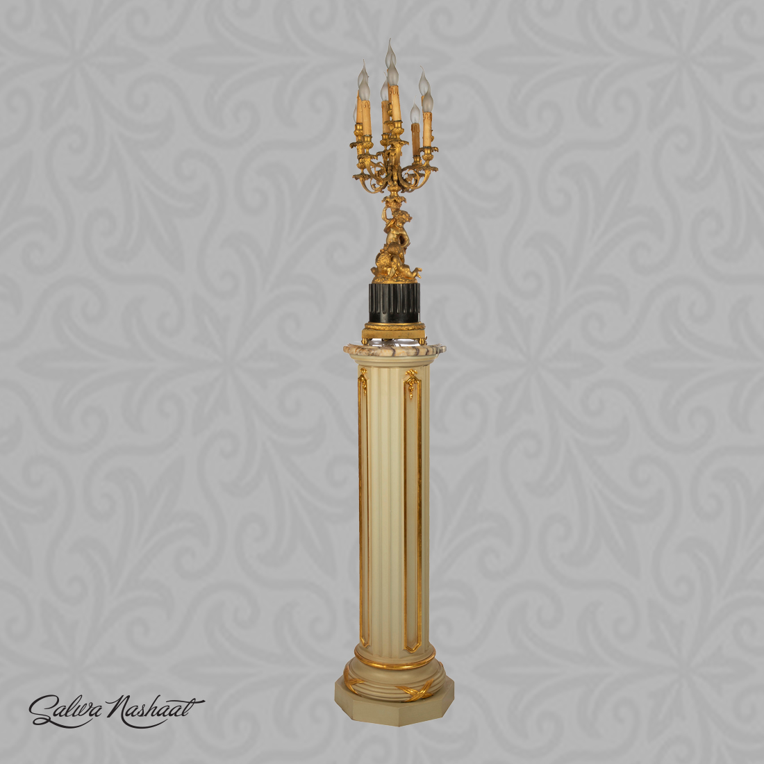 A column pedestal topped with French bronze candelabrum – it comes with 9 lamps candle for a bright look
