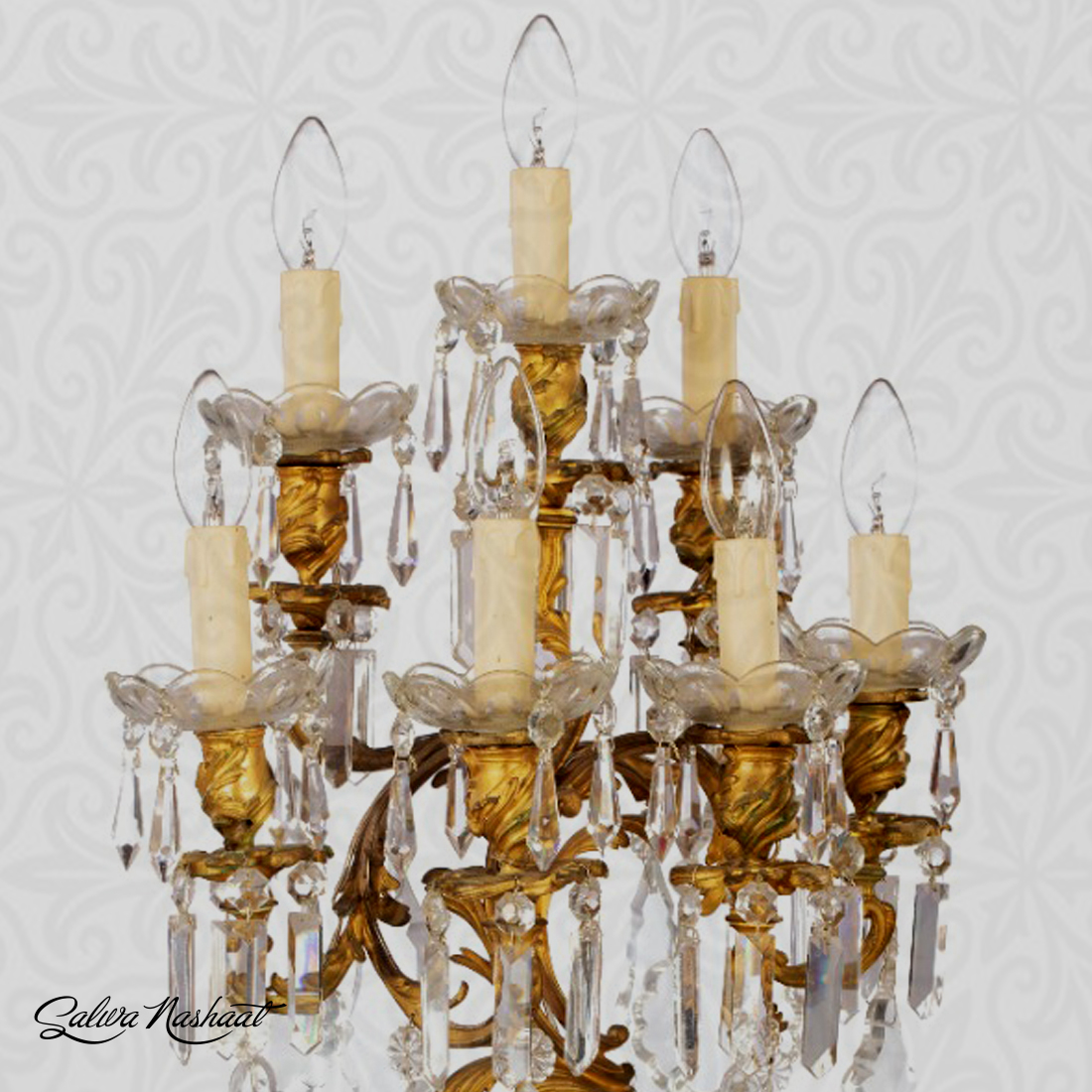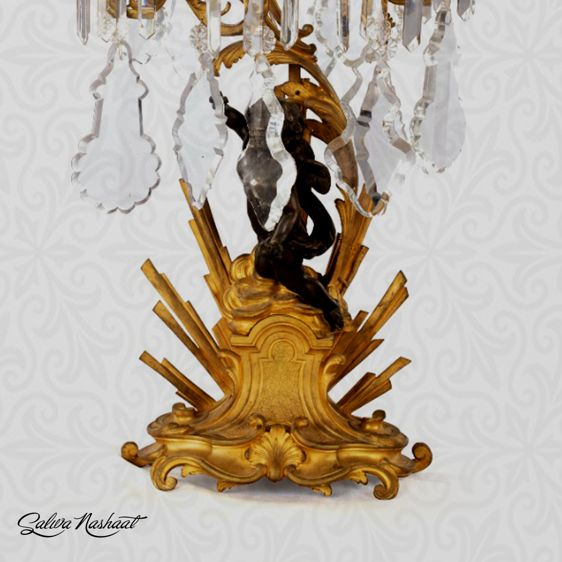Crystal mounted french bronze lamp with 7 candles of an angel , 83 cm